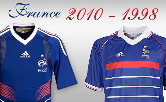 Les Bleus de Domenech lucirán en esta Copa del Mundo 2010 a Adidas como marca deportiva (por última vez, ya que luego los auspiciará Nike), y por eso se destapan con un diseño que evoca en algunas cosas el diseño de la Camiseta de la Copa del Mundo Francia '98.